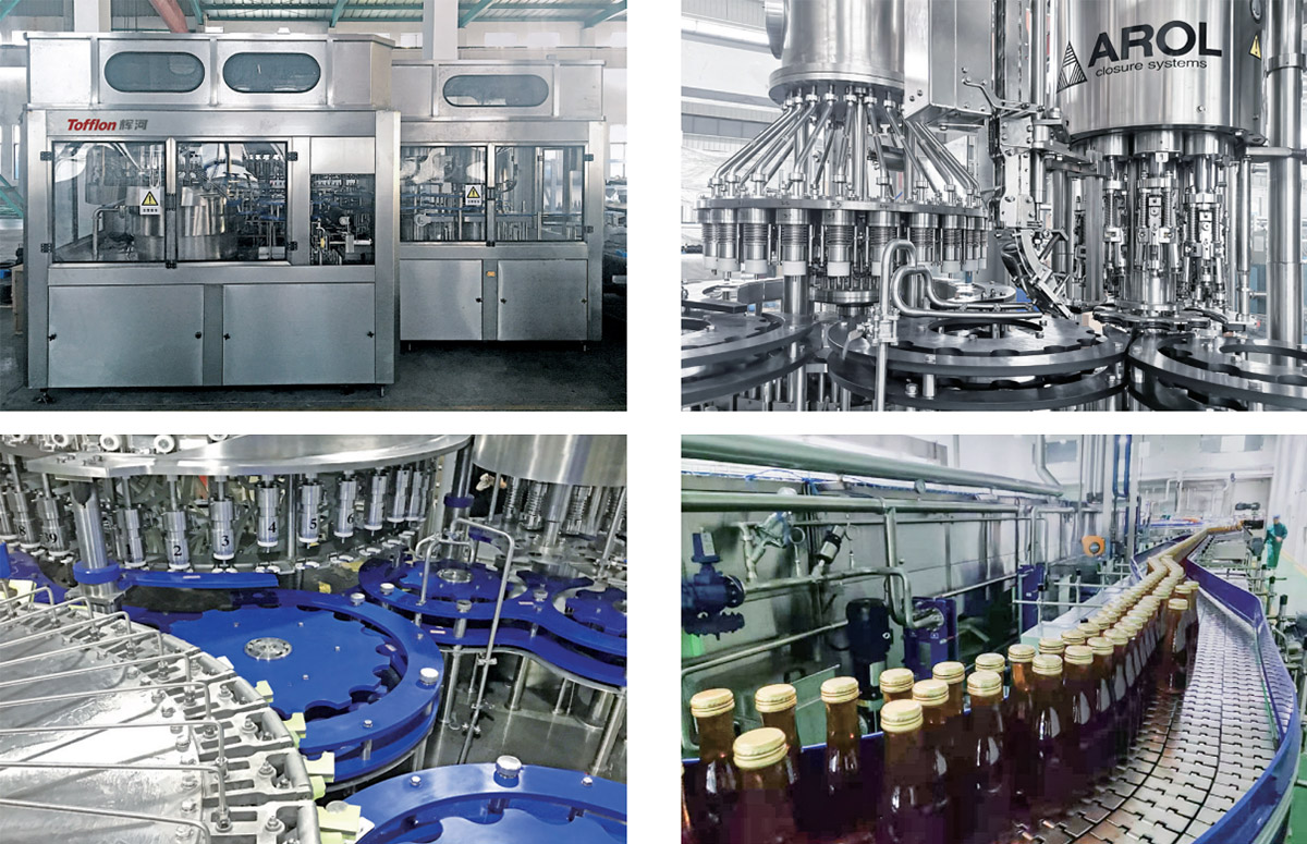 卸瓶機(jī)、洗瓶機(jī)、洗-灌-封主機(jī)、凈化、上蓋、理蓋、溫瓶/噴淋、實(shí)瓶輸送、貼標(biāo)機(jī)、裝箱/裹包、碼垛、電氣控制、工程設(shè)計(jì)和施工等。