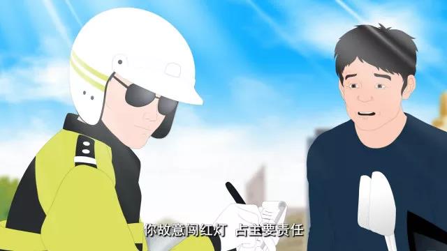 騎著摩托車的交警過(guò)來(lái)處理事故。交警對(duì)坐在地上的小強(qiáng)說(shuō):“你故意闖紅燈,要承擔(dān)本起事故的主要責(zé)任。”對(duì)轎車車主說(shuō):“你經(jīng)過(guò)路口車速?zèng)]有放緩,要承擔(dān)次要責(zé)任!”